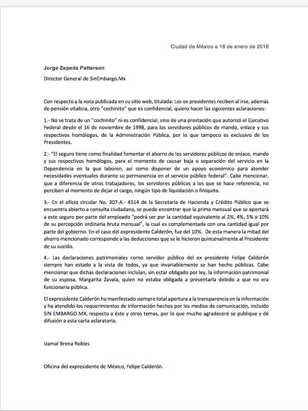 (NdeR: El 18 de enero pasado, la oficina del ex Presidente Felipe Calderón Hinojosa envió una carta a SinEmbargo MX, la cual se reproduce íntegra al final de esta nota).