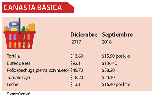 Según el Consejo Nacional de Evaluación de la Política de Desarrollo Social (Coneval), en este sexenio el costo de la canasta alimenticia urbana incrementó 31.40%, al pasar de mil 158.62 a mil 522.46 pesos.