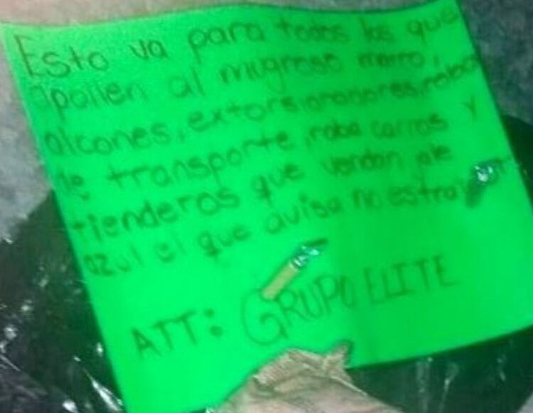 En el otro narcomensaje se leía: “Esto va para todos aquellos que apollen al mugroso marro, alcones, extorsionadores , robos de transporte, roba carros y tienderos que vendan ilegible azul el que avisa ... (ilegible) ATT. GRUPO ELTIE” (sic).
