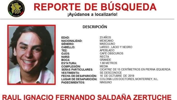 Saldaña Zartuche era originario de Monclova, Coahuila, y desapareció el mismo día que su amigo, Sandoval Trejo. Sin embargo, las fichas de búsqueda fueron emitidas el 21 y el 22 de octubre respectivamente, debido a la diferencia entre las denuncias de sus familiares.
