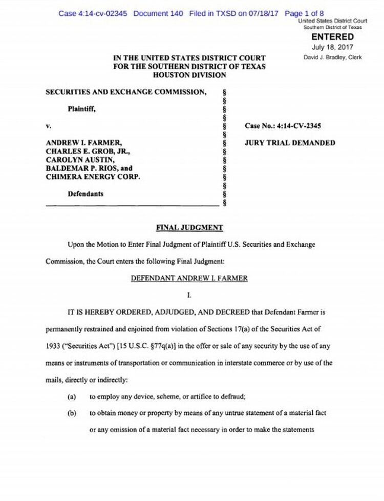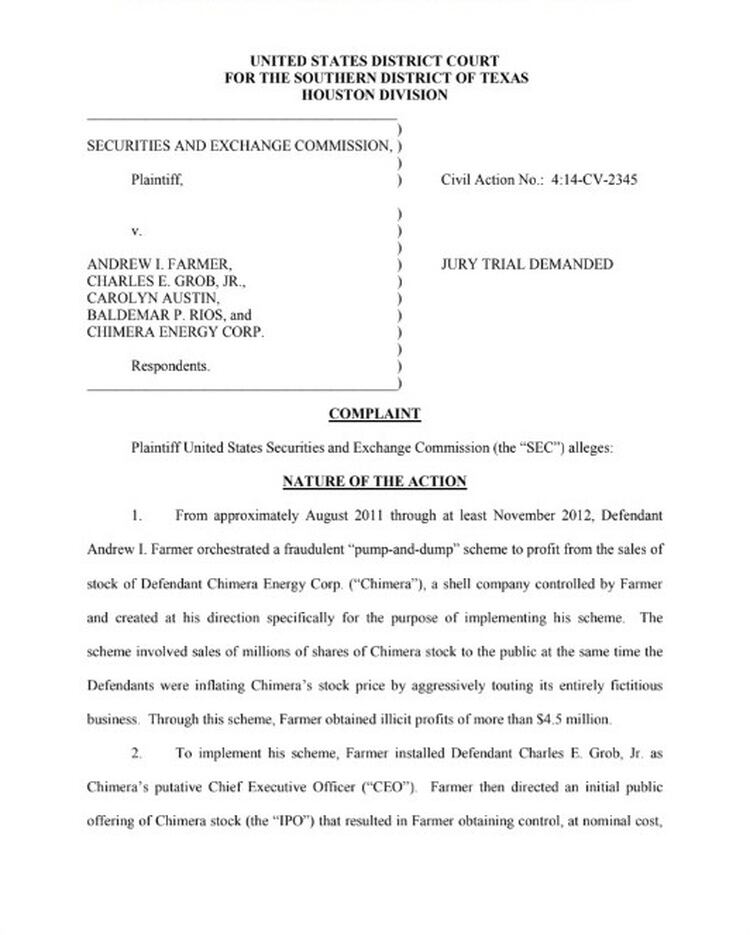 La SEC intervino a finales de 2012 para suspender la negociación de acciones de Chimera e inició una investigación contra el dueño y sus directivos por presunto fraude. El 24 de julio de 2017, un juez del tribunal del distrito sur de Texas había sentenciado a los involucrados en este fraude. Al dueño de Chimera lo condenó apagar USD 9 millones en multas y reparación del daño.