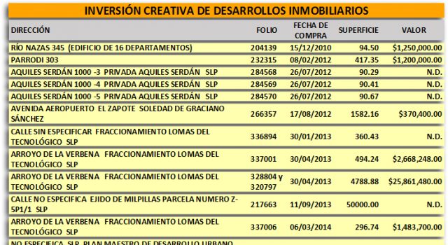 Únicamente en San Luis Potosí existen al menos 15 inmuebles registrados a nombre de Inversión Creativa de Desarrollos Inmobiliarios. De entre ellos destacan tres terrenos de 296, 494 y 4 mil 788 metros cuadrados que fueron comprados en marzo del 2014 a una persona de nombre Martha Patricia Sánchez Ruiz.
