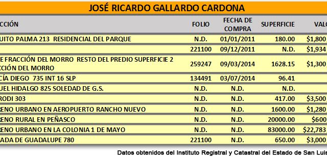 En enero del 2017 Ricardo Gallardo Juárez y su esposa adquirieron, por separado, las parcelas 133 Z-3 P1 y 135 Z-3 P/1, respectivamente, pertenecientes al Ejido la Rinconada donde también cuentan con propiedades su Candy Araceli Gallardo Cardona y Ruth Miriam González Silva.