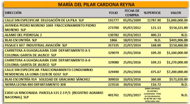 Luego de entregarle el poder municipal a su hijo y nuera, respectivamente, Gallardo Juárez y María del Pilar continuaron acumulando propiedades. Sin que conste el valor de la operación, en marzo del 2013 María del Pilar Cardona adquirió un terreno de 400 metros cuadrados en el exclusivo fraccionamiento “El Pedregal” al poniente de la capital potosina; privada donde hasta la fecha vive junto a Ricardo Gallardo.