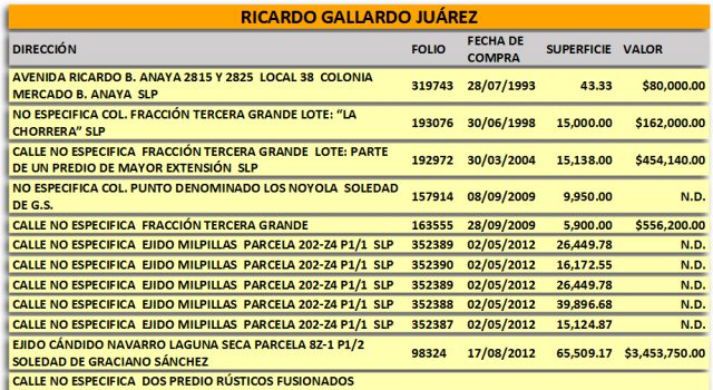 En un solo día, el 2 de mayo del 2012, Gallardo Juárez compró cinco parcelas, de entre 15 mil y 26 mil metros cuadrados cada una, en el Ejido Milpillas a un mismo vendedor de nombre Eustacio Alonso Aguilar. Poco después, en agosto, adquirió la parcela 8Z-1 P1/2 de 65 mil 509.170 metros cuadrados en el Ejido Cándido Navarro perteneciente a Soledad de Graciano Sánchez. Todos ellos fueron registrados a nombre del entonces alcalde soledense. Mientras que, el inmueble restante, y de menor tamaño (121.13 metros cuadrados), se encuentra sobre la Avenida Pedro Moreno y le costó 156 mil 321 pesos a María del Pilar Cardona Reyna.