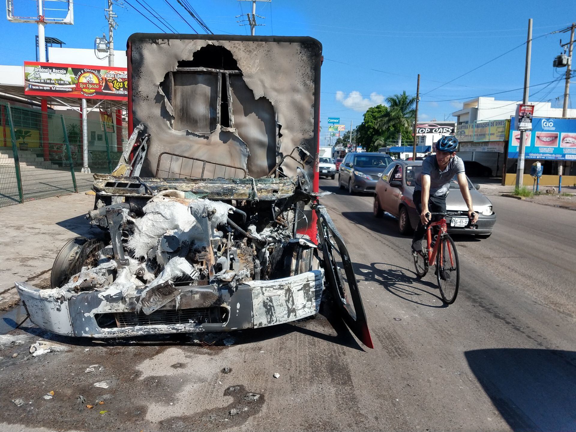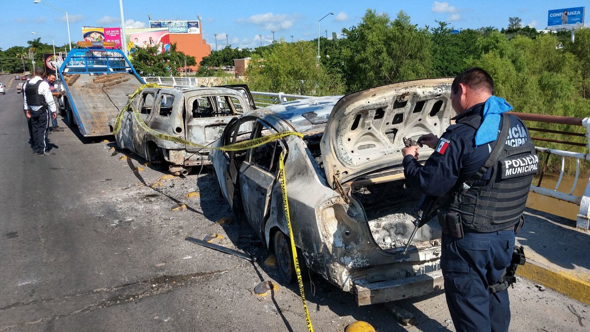 Decenas de vehículos quedaron calcinados tras el "Culiacanazo". (Cuartoscuro)A manera de evidenciar la desigualdad numérica entre los castrenses y los pistoleros del cártel, el corrido menciona que “se les hizo facilita, se metieron con la familia Guzmán. Se les apareció el diablo y el mismo infierno aquí en Culiacán”