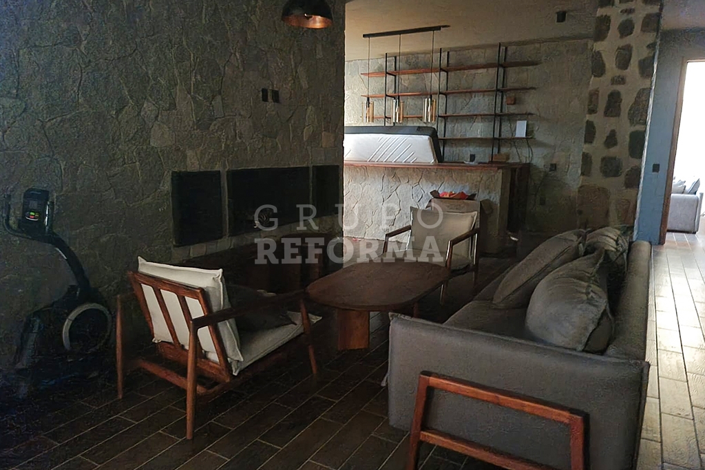 En la planta baja de la cabaña, en una de las salas con muebles rústicos, había una bicicleta elíptica.